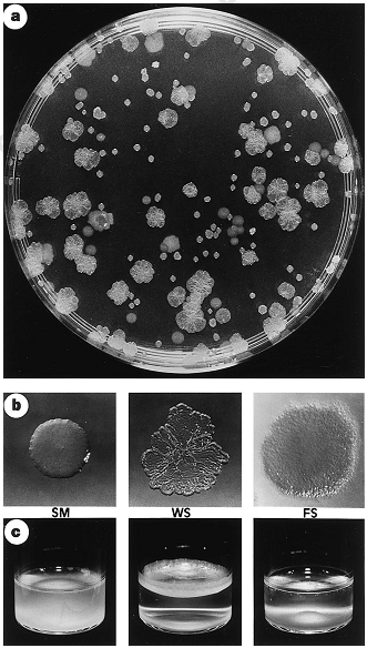 চিত্র ১ – Pseudomonas fluorescens ব্যাক্টেরিয়ার ফিনোটাইপিক পরিবর্তনঃ (a) ৭দিন পর ব্যাক্টেরিয়ার ফিনোটাইপিক প্রকরণগুলো স্পষ্ট হয়ে উঠেছে। (b) প্রকরণগুলোকে প্রধাণত তিনটি শ্রেণীতে পৃথক করা যায়ঃ আদি মসৃণ প্রকরণ (SM) এবং নতুন কুঞ্চিত (WS) ও ঘোলাটে প্রকরণ (FS)। (c) ব্যাক্টেরিয়াগুলোর স্ব স্ব পাত্র