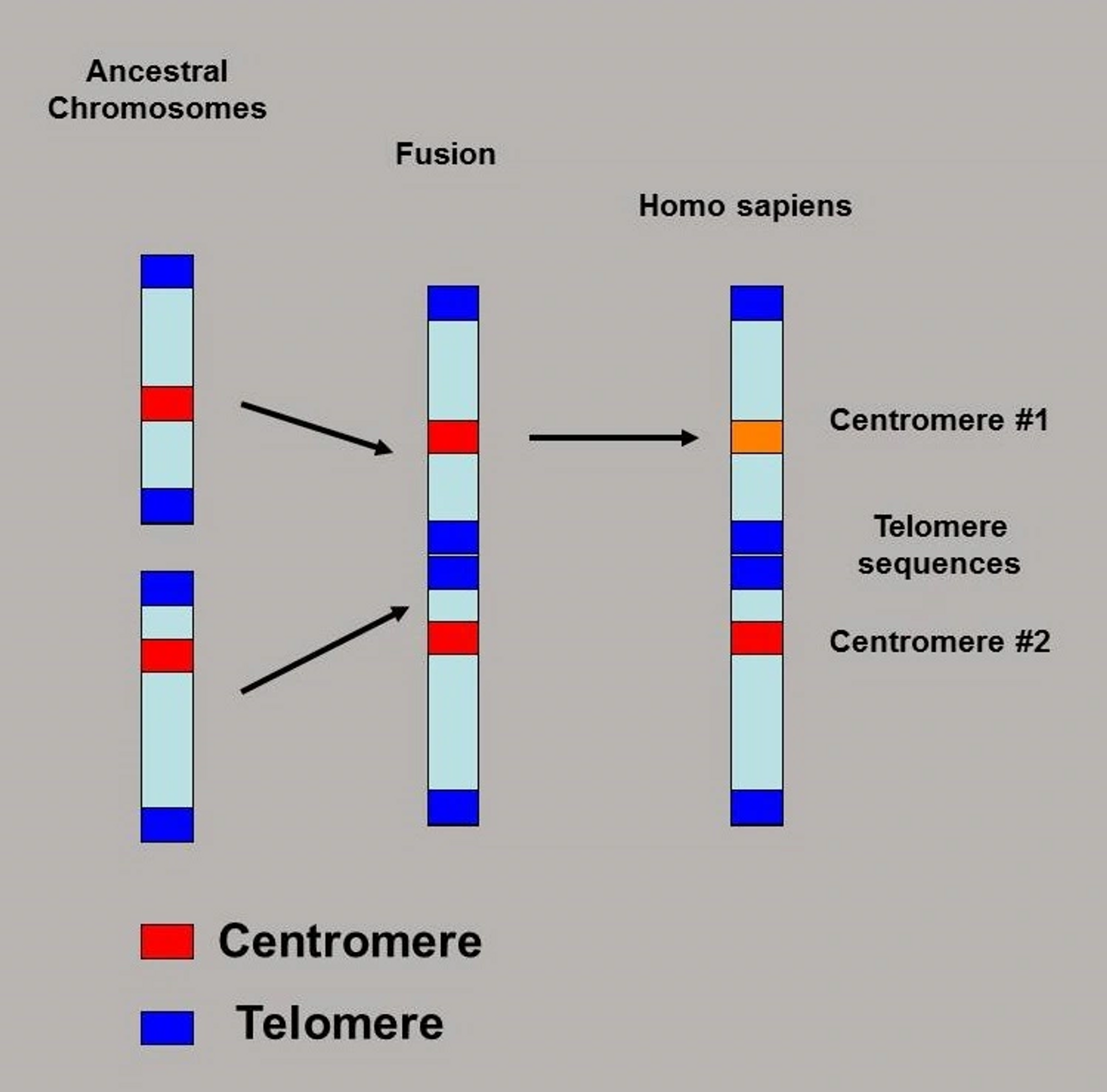 এবারে ছোটবেলায় পড়ে আসা ক্রোমোসোমের গঠণটা একটু রিভিশন দেয়া দরকার। ক্রোমোসোমের দুই প্রান্তে থাকে টেলোমিয়ার নামে একটা অংশ। মাঝখানে থাকে সেন্ট্রোমিয়ার। এখন যদি দুইটা ক্রোমোসোম একটার প্রান্তে আরেকটা যুক্ত হয়, তাহলে আমরা যে একটা ক্রোমোসোম পাবো, তাতে দেখা যাবে মাঝখানে এক জোড়া টেলোমিয়ার সিকোয়েন্স এবং এর দুই পাশে একটা করে সেন্ট্রোমিয়ার। আদৌ কি আমাদের আছে এমন কোন ক্রোমোসোম?